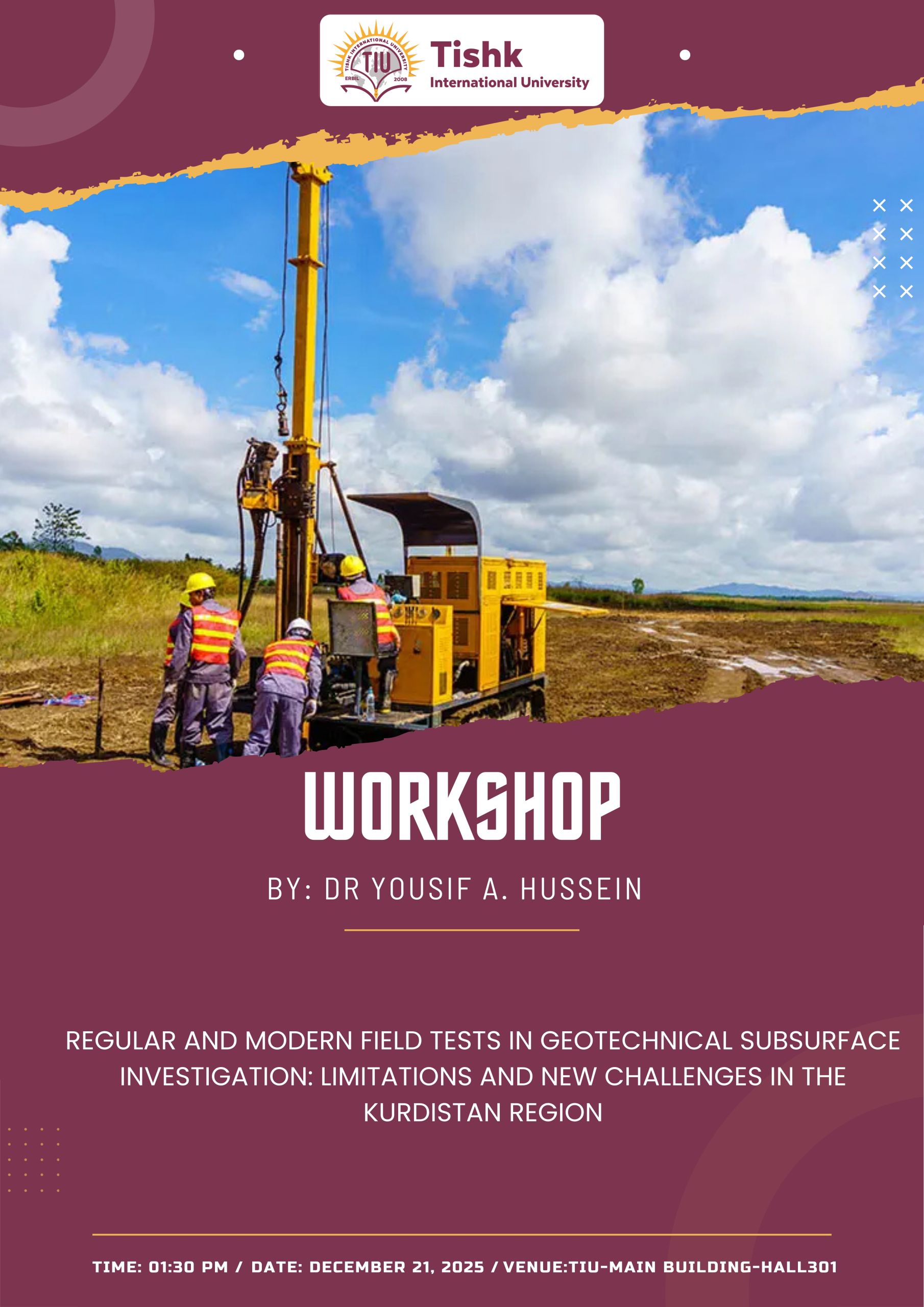 abdulla hassan2025-12-14T09:54:00+00:00Regular and Modern Field Tests in Geotechnical Subsurface Investigation: Limitations and New Challenges in the Kurdistan Region The Civil Engineering Department at Tishk International University is pleased to invite you to a workshop titled "Regular and Modern Field Tests in Geotechnical Subsurface Investigation: Limitations and New Challenges in the Kurdistan Region." Speaker: Dr. Yousif A. Hussein Geotechnical subsurface investigation is a critical stage in any construction project. Conducted during the early phases of planning and design, it provides essential data on soil and rock properties that directly influence foundation design, project safety, and overall cost. This workshop will explore traditional and [...]