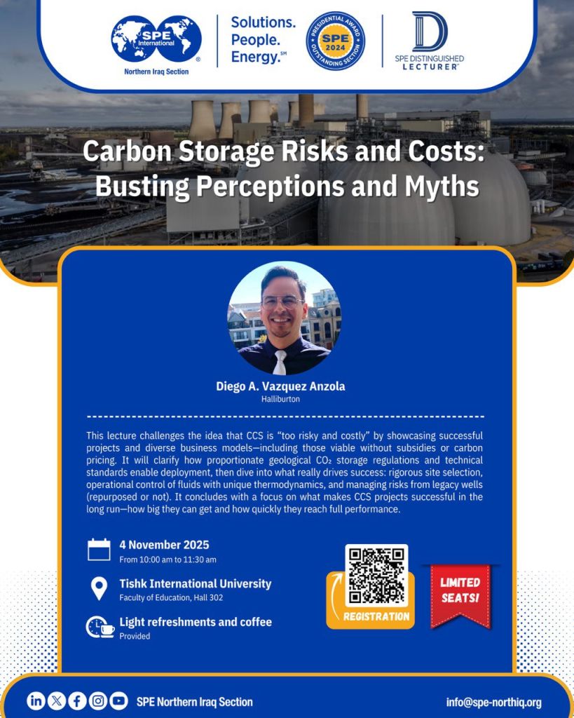 The Petroleum and Mining Engineering Department at Tishk International University, in collaboration with the Society of Petroleum Engineers TIU Student Chapter and SPE Northern Iraq Section, will host an international workshop on November 4, 2025. This event features distinguished industry expert Diego A. Vazquez Anzola from Halliburton, addressing critical perceptions and realities in carbon capture and storage.