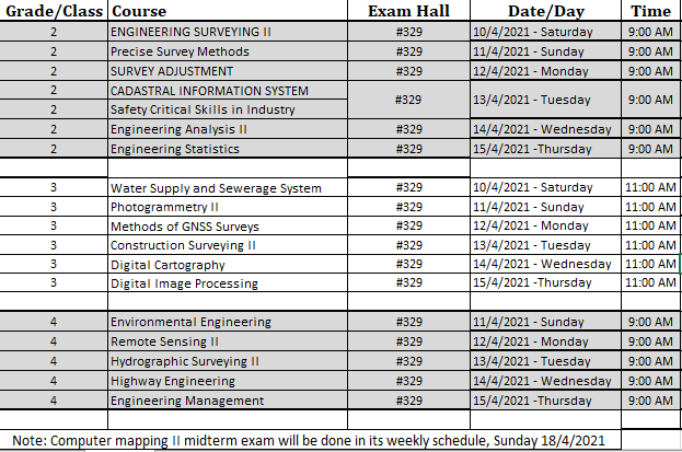 Dear students kindly find your midterm examination schedule for the academic year 2020-2021 Spring Semester.